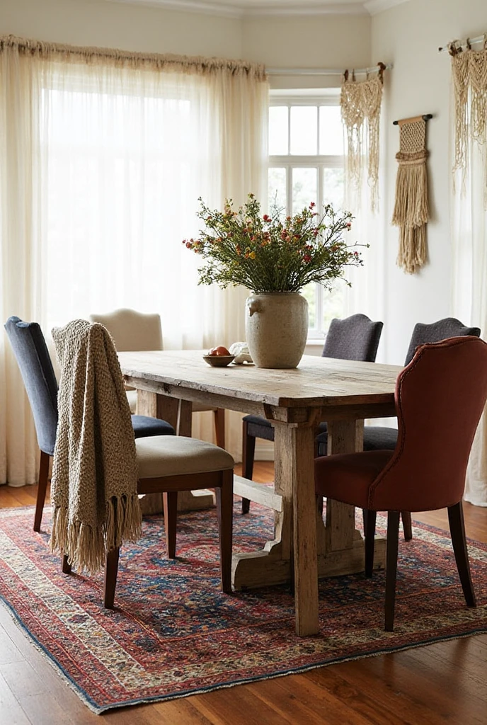 Using macramé for wall hangings or curtain tiebacks is a classic boho touch. It adds a handmade feel that embodies the spirit of bohemian design. Textures create visual interest, making your dining room feel rich and inviting.