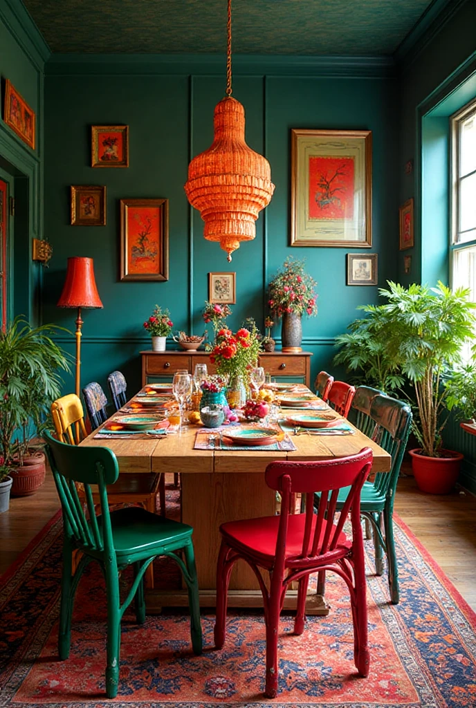 Colors matter a lot in a boho chic dining room. You wanna create an atmosphere that feels warm and inviting. Bold jewel tones and earthy hues are your best friends here. Think about rich reds, deep greens, burnt oranges, and warm browns.