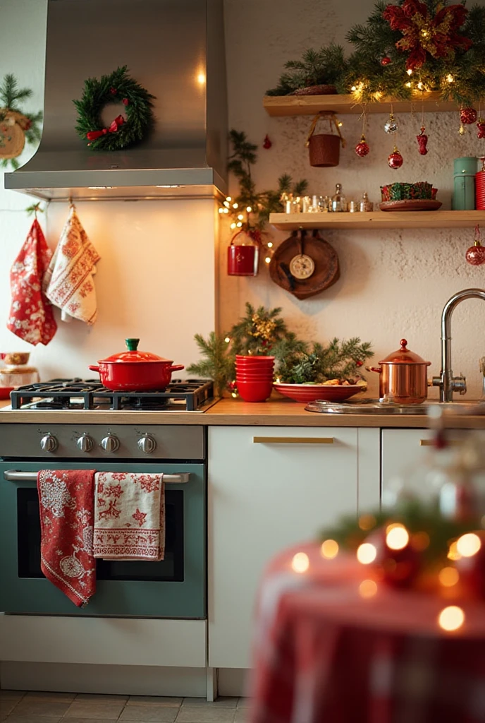 Your kitchen deserves some holiday cheer too! Hang festive towels, and add a holiday-themed tablecloth.