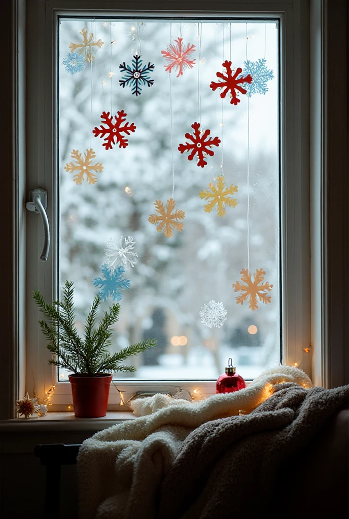 Make your windows festive! Hang ornaments or snowflakes from the window. You can use fishing line for a floating effect.