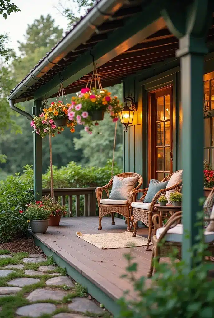 Think about adding comfortable seating. Wicker chairs or a swing can add charm. Don’t forget to include potted plants or hanging baskets to keep the greenery theme going.