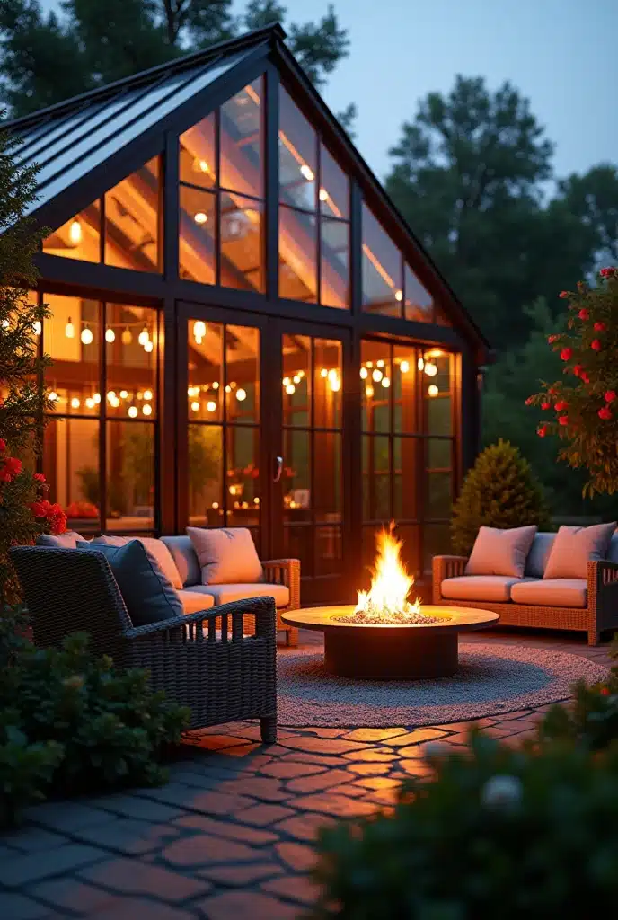 A fire pit can be a fantastic addition to your green house exterior. It creates a gathering space for family and friends.