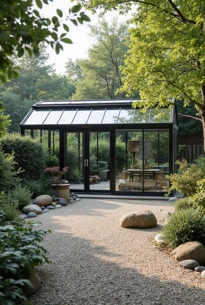 A zen garden can be a tranquil addition to your green house exterior. Use gravel, rocks, and minimalistic plants to create a calming space.
