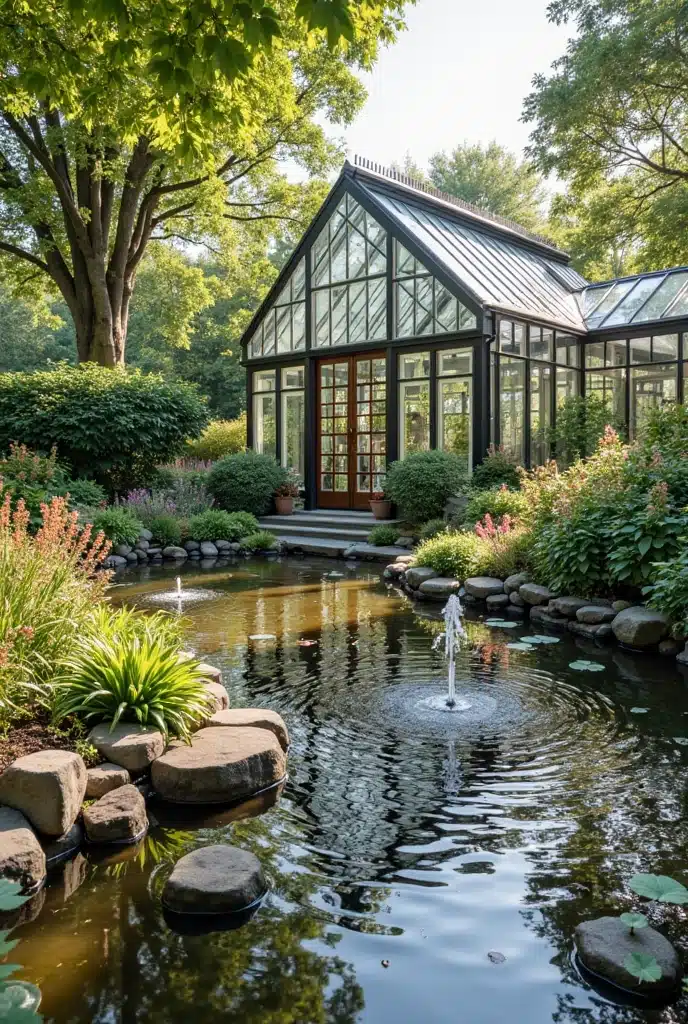 Surround it with plants to create a serene oasis. This also attracts wildlife, adding more life to your garden. It’s a beautiful way to blend nature with your green house.