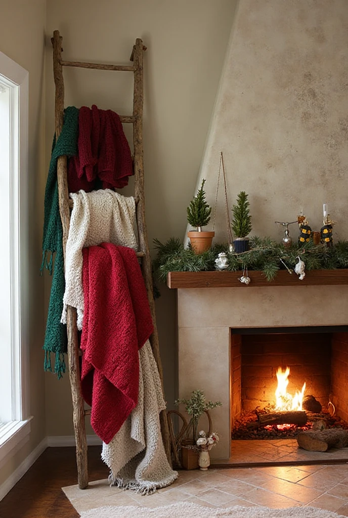 Instead of just decorative items, how about using a cozy blanket ladder? Lean it against the wall beside your fireplace. Drape some soft, holiday-themed blankets over it.