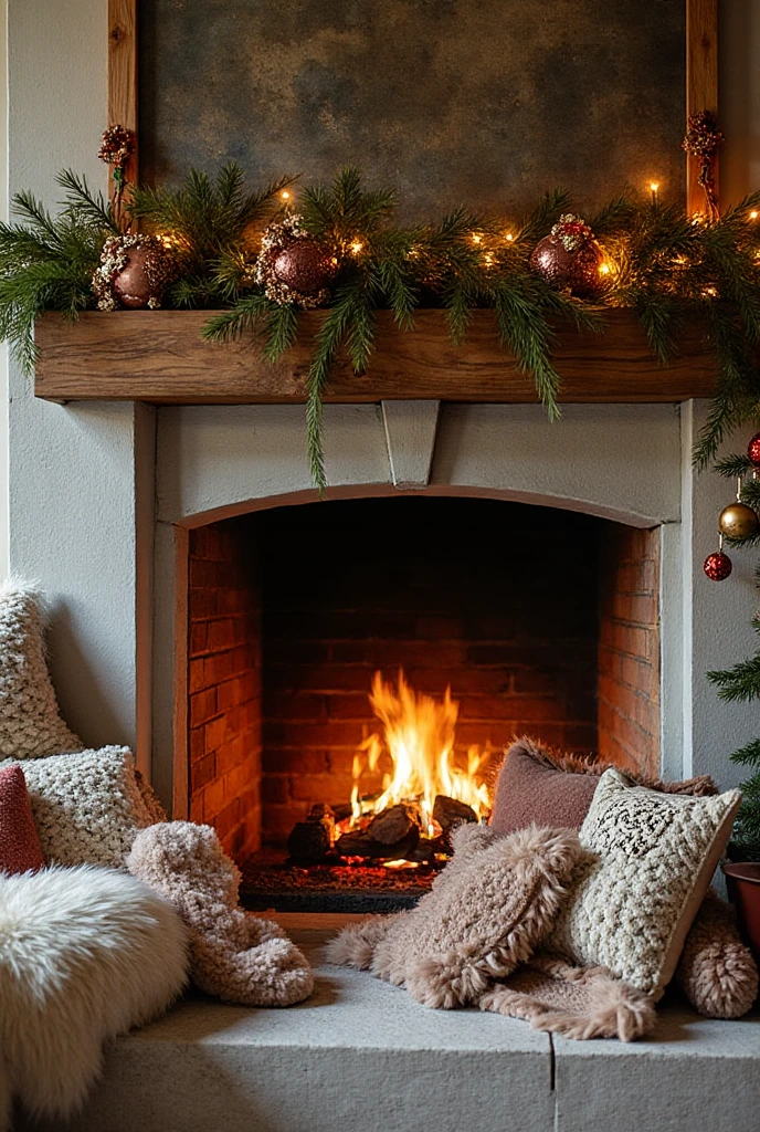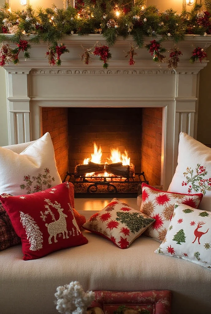 Add some holiday-themed pillows to your seating area near the fireplace. Choose cozy fabrics with festive designs.