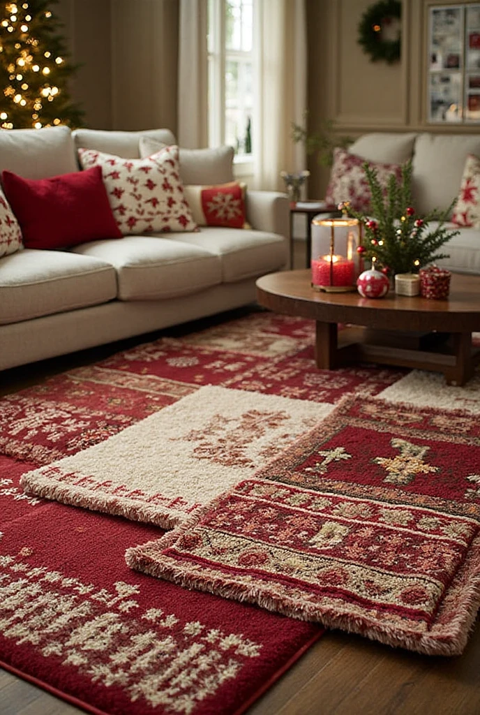 If you want to keep your existing rug, consider layering a holiday-themed runner on top. It adds depth and visual interest while keeping the room cozy.