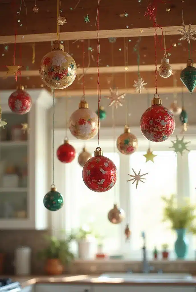 Who says ornaments are just for trees? Bring some festive flair into your kitchen by hanging ornaments from the ceiling or light fixtures. This whimsical touch can add a playful element to your decor. Use clear fishing line for a floating appearance, making it look as if the ornaments are magically suspended in mid-air.