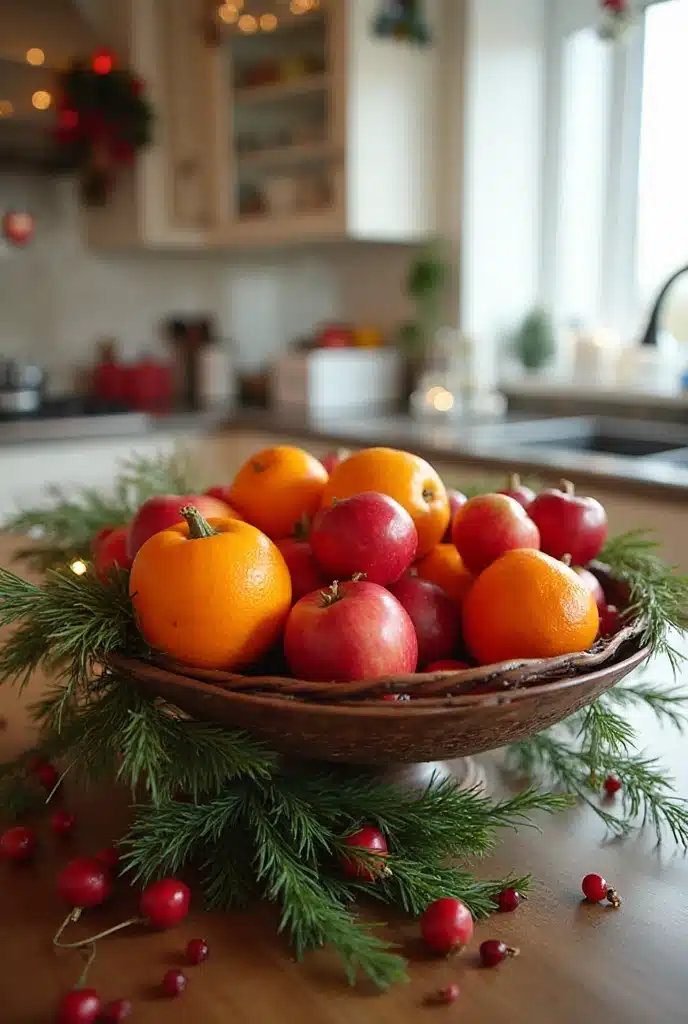 Using seasonal fruits like oranges, apples, and pomegranates for a natural and colorful display can add a lovely touch to your kitchen. Arrange them in a decorative bowl or on a tiered stand. This not only looks beautiful but also smells amazing, bringing the essence of the season into your home.