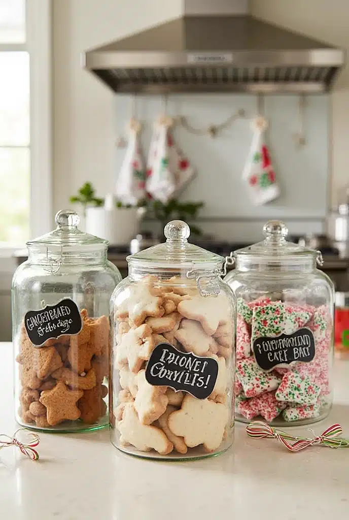 A glass cookie jar filled with holiday treats is not only a sweet touch but also a charming decor piece. Choose jars that fit your style—vintage or modern. Fill them with homemade gingerbread cookies, peppermint bark, or even colorful holiday candies.