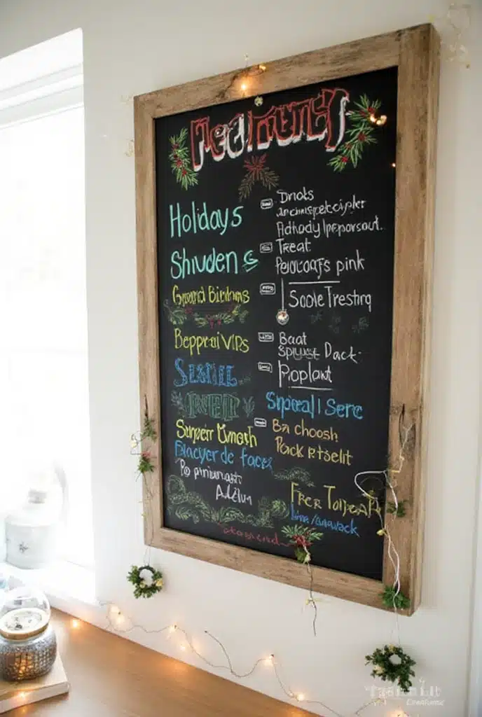 If you love to cook and plan meals during the holidays, a chalkboard menu can be both functional and decorative. Use it to write down your holiday recipes or special dishes for the week. It not only helps keep you organized but also adds a rustic touch to your kitchen.