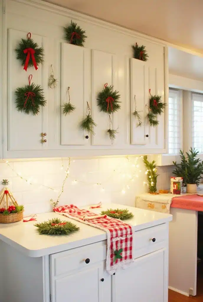 Wreaths aren’t just for doors; they can be a lovely addition to your kitchen cabinets as well. Adorn your kitchen cabinets with small, festive wreaths to bring in some holiday cheer. You can use mini versions made of evergreen, or even opt for a more modern look with metallic accents or colorful ribbons.