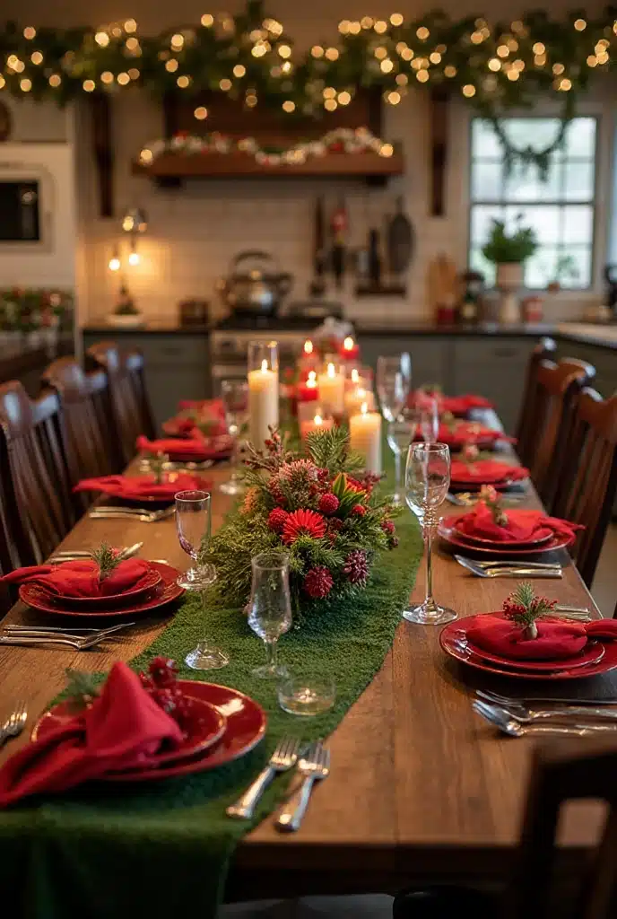 Setting your kitchen table with a holiday-themed tablecloth, plates, and napkins can create a festive atmosphere. Layering different textures can evoke a cozy feel. Consider using a burlap runner paired with elegant china or bright red and green plates.