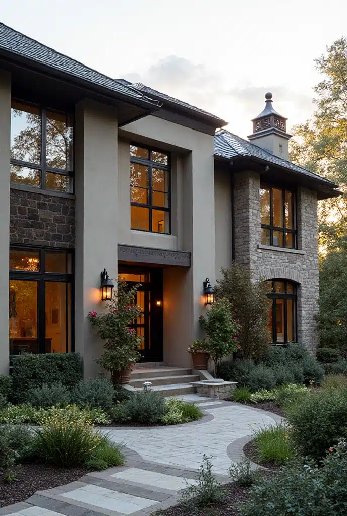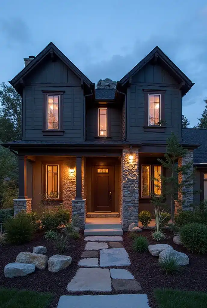 Imagine a charcoal house with a stone chimney. It feels grounded and sturdy. This combination is timeless, ensuring your home remains stylish for years to come.