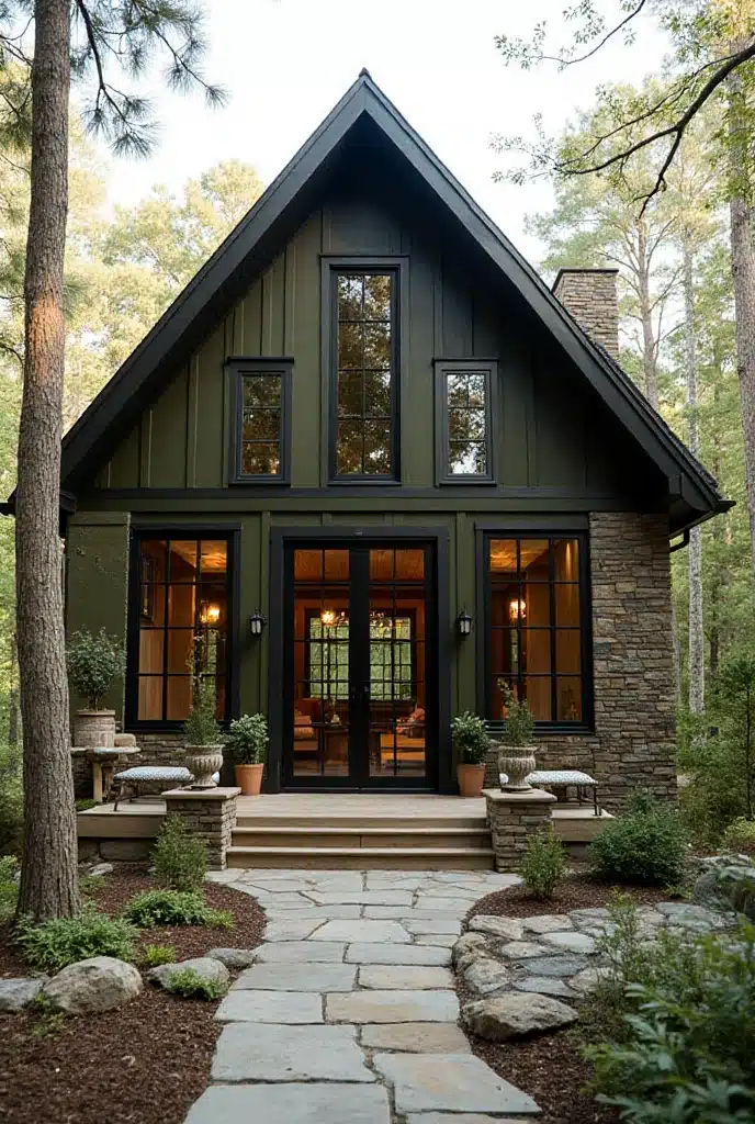It creates a serene and peaceful vibe. Imagine a house nestled among tall evergreens, with a green exterior. It feels cozy and welcoming. Plus, it’s a perfect backdrop for colorful flowers in the garden.