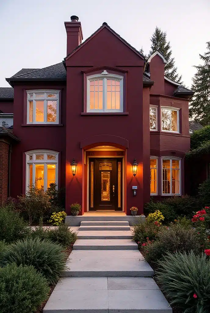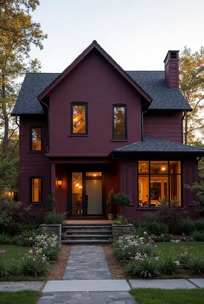 Imagine a deep plum house surrounded by greenery. It’s striking and elegant. This color pairs beautifully with gold or brass accents, enhancing its opulence.