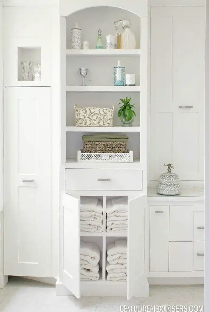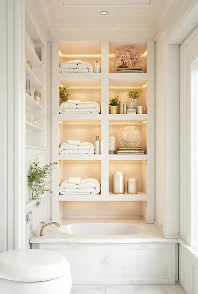 Open shelving can add both style and function to your bathroom. It allows you to showcase beautiful towels, curated decor pieces, or your favorite skincare products. Keep it organized and aesthetically pleasing, and it’ll become a focal point in your bathroom.