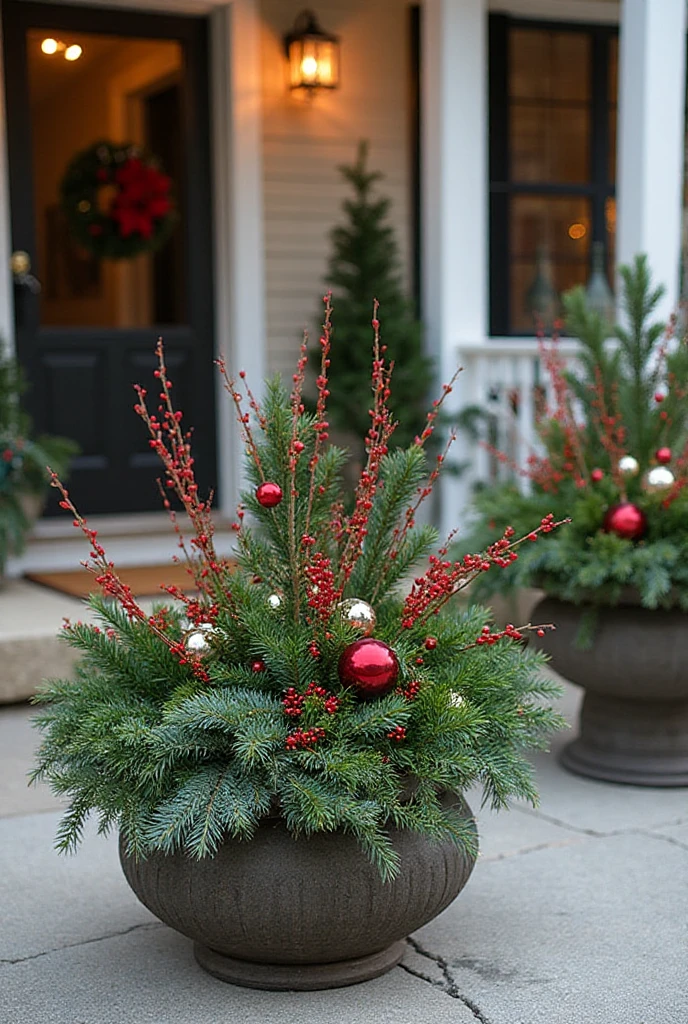 Use your existing planters to create cheerful displays. Fill them with seasonal plants like poinsettias or evergreens.