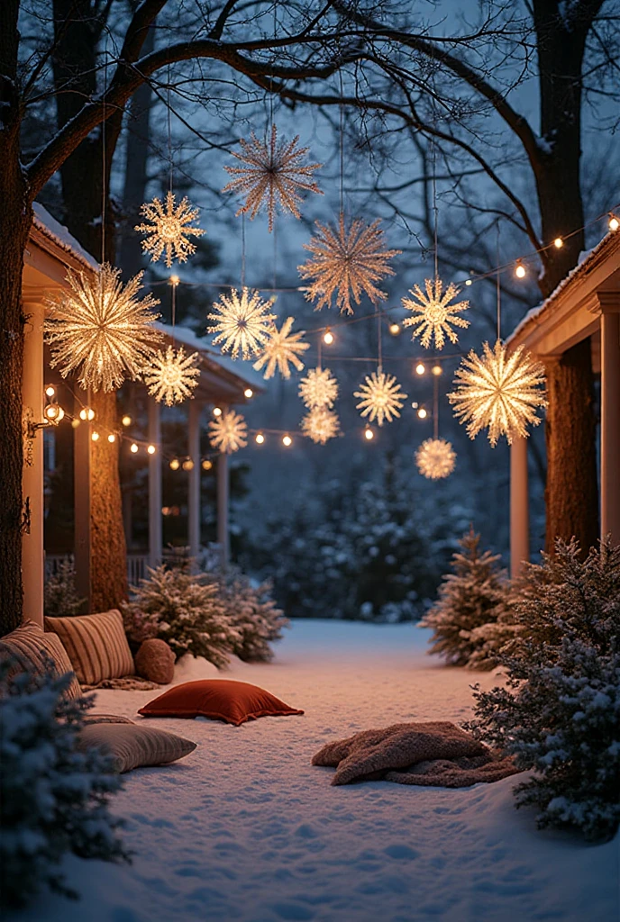 Create your own snowflakes to hang from your porch or trees. Use white paper or even old book pages. Cut them into unique designs and hang them with string.