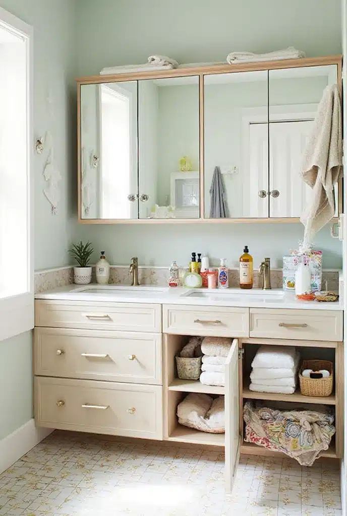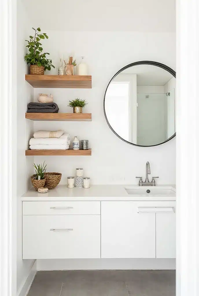 Open shelving is practical and stylish. It allows you to display your favorite items while keeping essentials at hand. Imagine your pretty towels neatly rolled and displayed. It’s a simple way to add a personal touch to your space while keeping it functional.