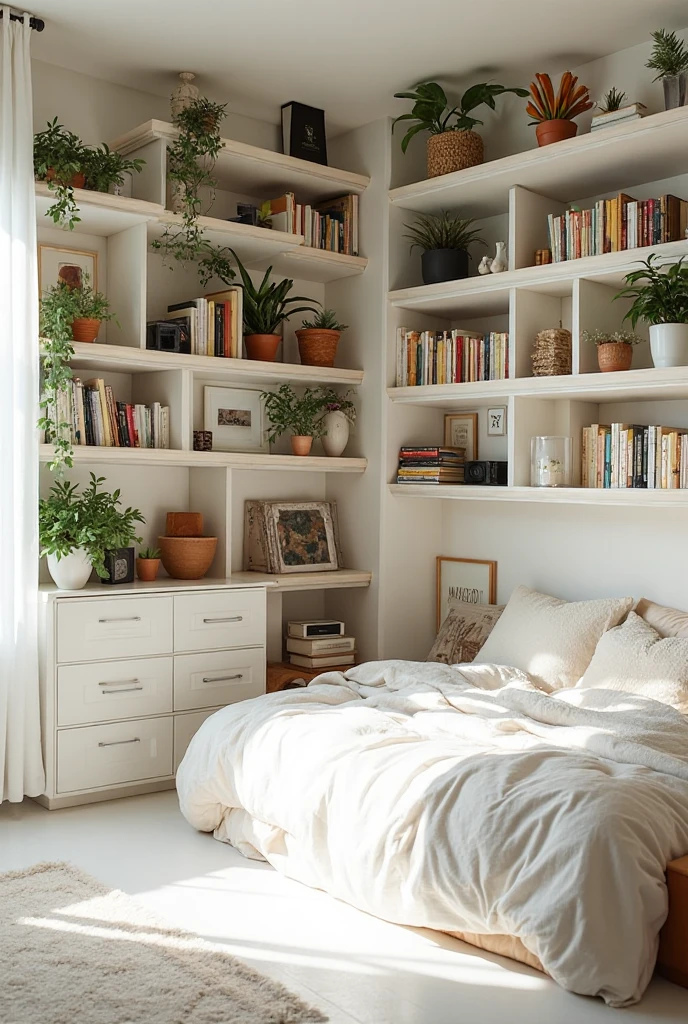 Open shelving isn’t just for kitchens. It can work wonders in bedrooms too. Display books, plants, and personal items on open shelves.