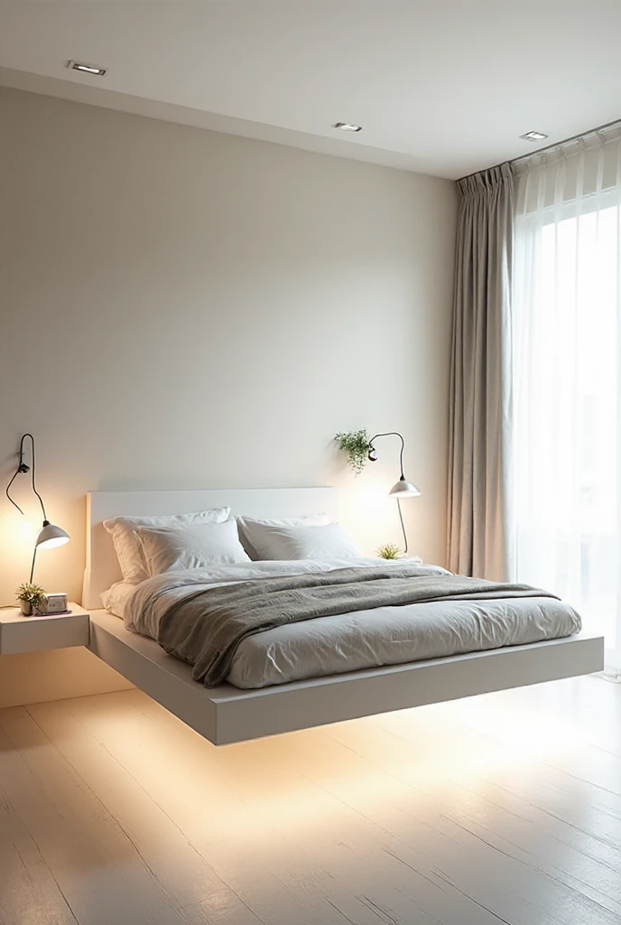 Floating furniture is a clever way to create an illusion of space. Wall-mounted nightstands, floating shelves, and even a bed that appears to hover can open up your room.
