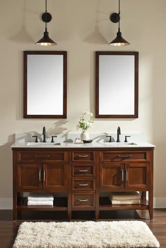 Rustic vanities bring a cozy feel to any bathroom. Think distressed wood and farmhouse sinks that evoke a sense of warmth and comfort. This style is perfect for creating a warm, inviting bathroom. Add some greenery to enhance that rustic charm. It’s all about comfort and coziness.